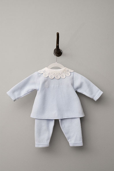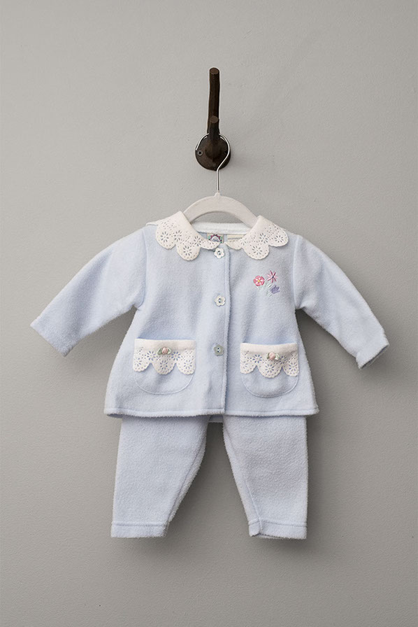 Baby blue sleepwear set with top and bottoms. Top features full length buttons on front and two front pockets as well. Bottoms have an elastic waistband.