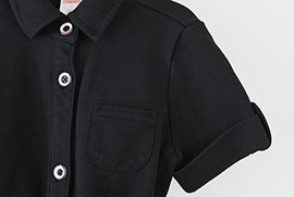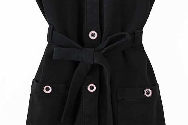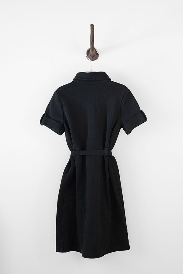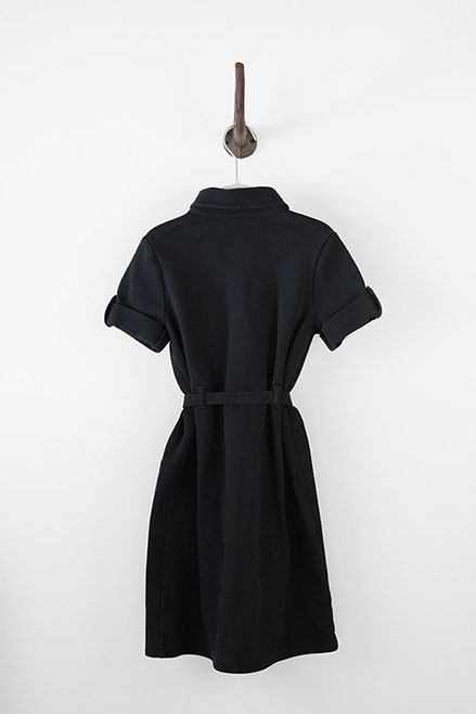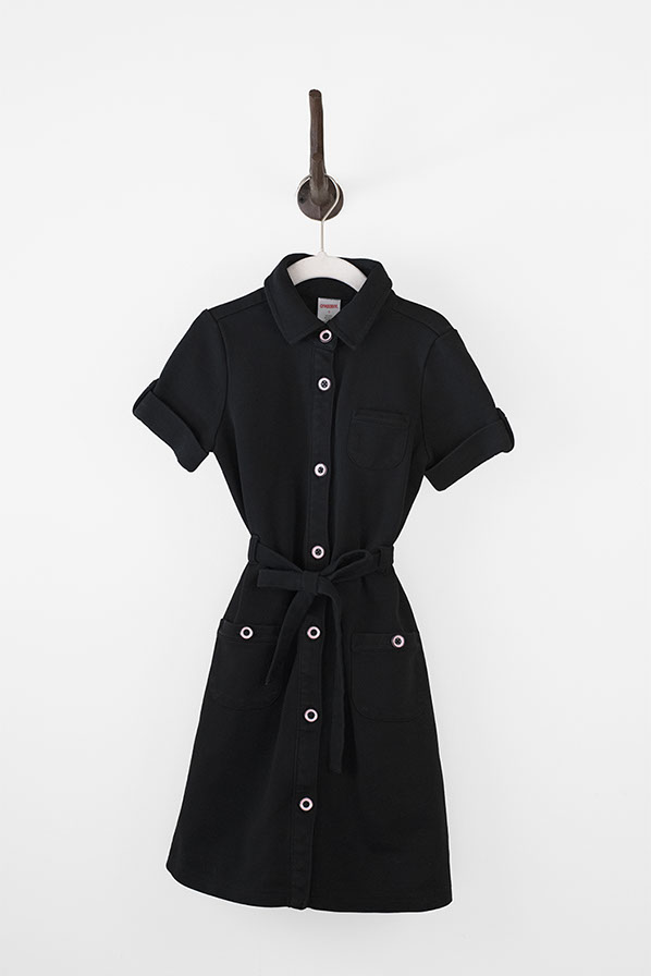 Beautiful button down black dress with belt. Dress has pink, white, and black buttons down front as well as buttons on sleeves and pockets. Three front pockets and a collar are also present.