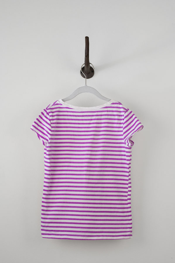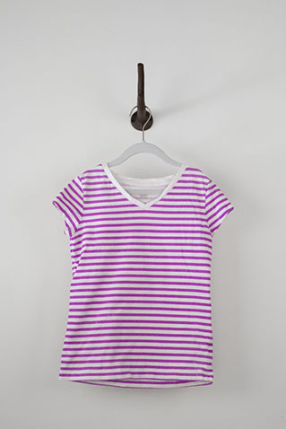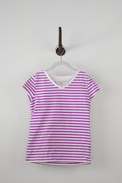 Magenta and white striped t-shirt with v-neck and short cap sleeves.