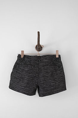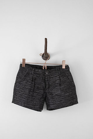 Beautiful grey, silver, and shimmery silver shorts with horizontal stitching. Shorts are pleated and feature a zipper and button in front. Also featured are two front pockets, two back pockets, and belt loops. Shorts also are adjustable with inner elastics.
