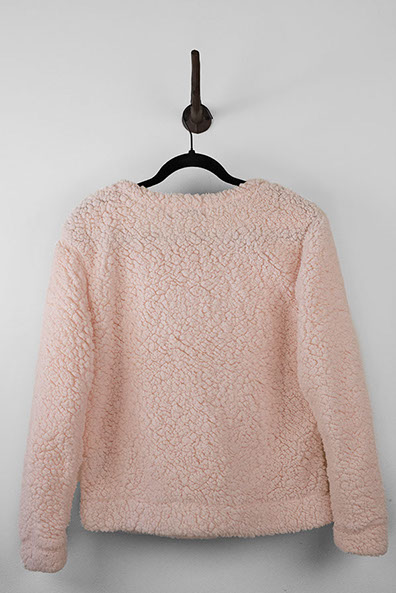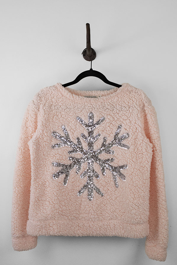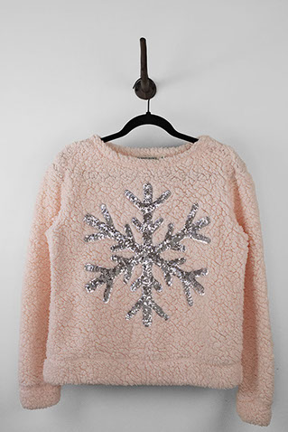 Super comfy pink sweater featuring a silver sequin snowflake on front. Sweater has a rounded neckline and is fuzzy on the outside.