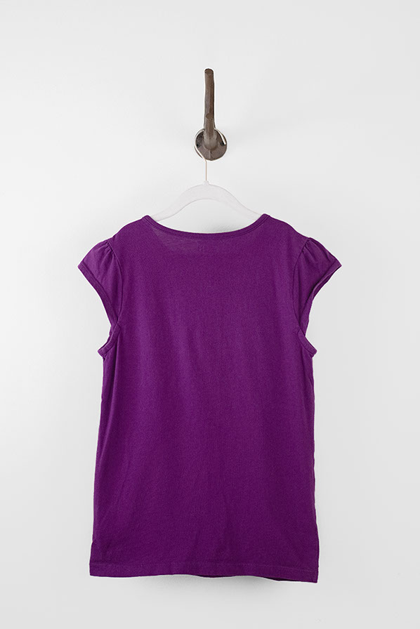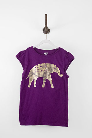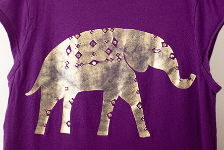 Antiqued purple t-shirt with gold elephant and embellished golden sequins.