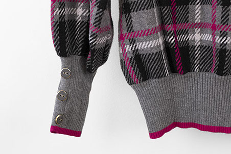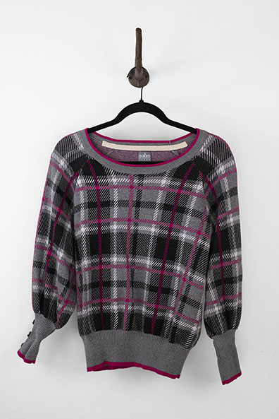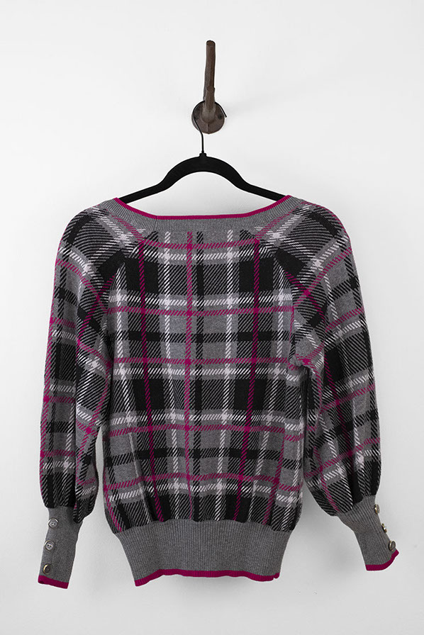 Lovely grey and fuchsia plaid sweater with ribbed cuffed sleeves and waistband. This scoop neck sweater also features three buttons on each loose-fitted sleeve.