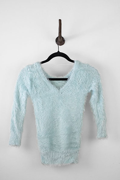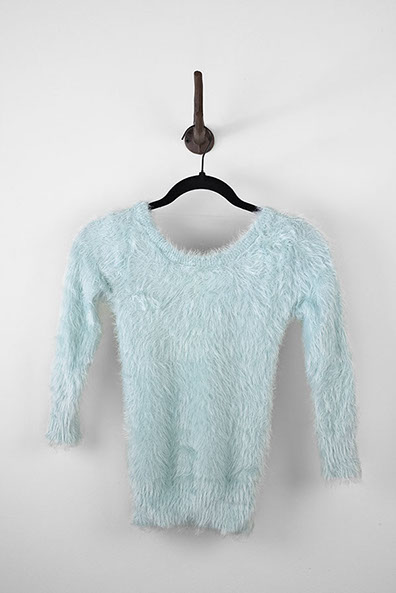 Ice blue faux fur sweater. Features 3/4 length sleeves and v-neck back with a plastic, stretchy strap.