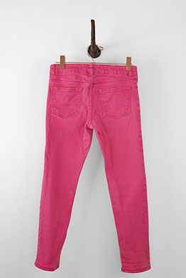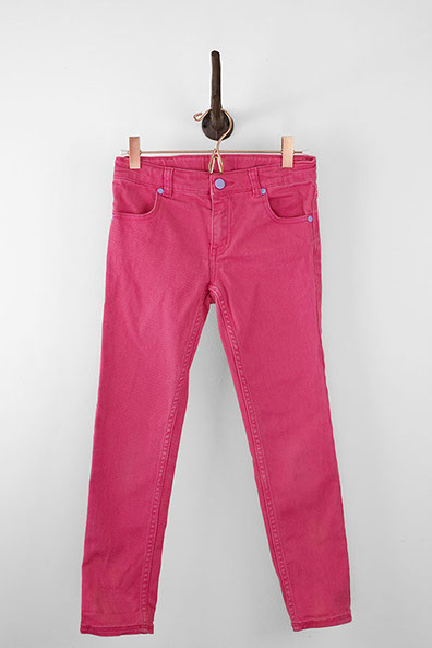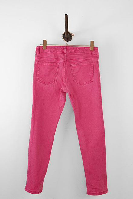 Bright pink straight jeans with two front pockets with rivet details. Jeans also feature belt loops and two back pockets.