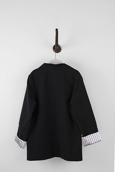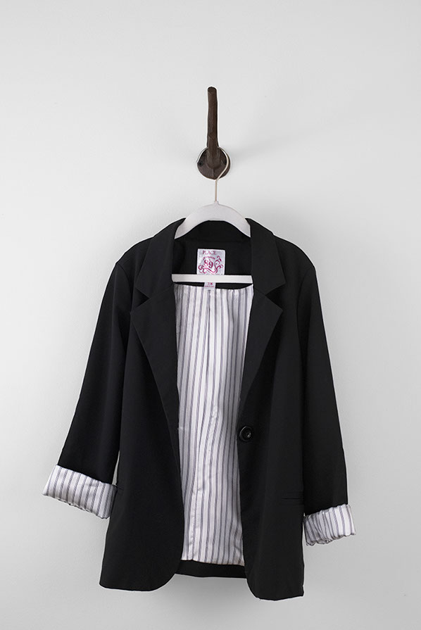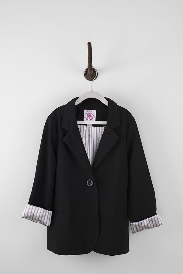 Fabulous black blazer with pin stripe lining features one button on front, an exaggerated collar, and two front pockets. Sleeve cuffs can be folded down for an all black appearance, or folded up for a chic, classy look.
