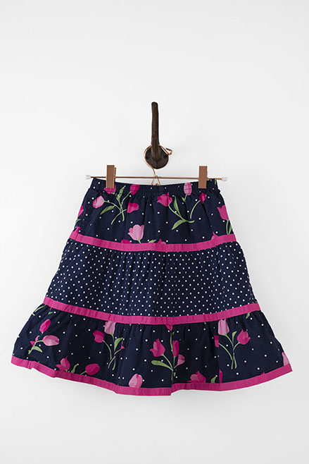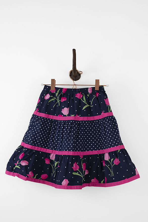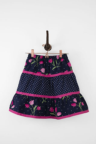 Adorable skirt with flower and polka dot patterns. Skirt has an elastic waistband and lining.