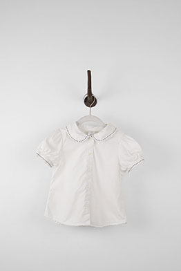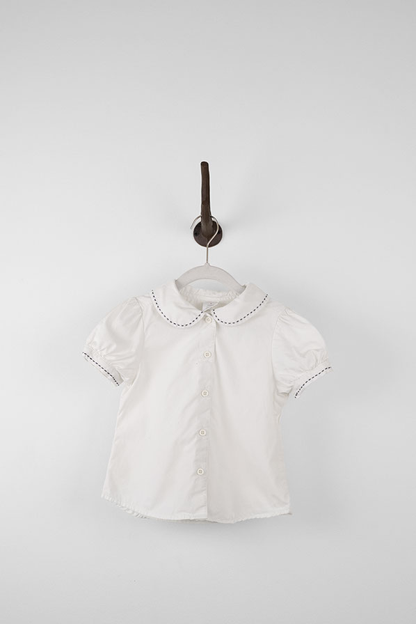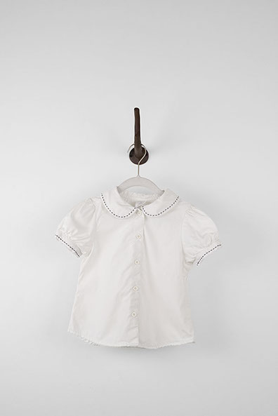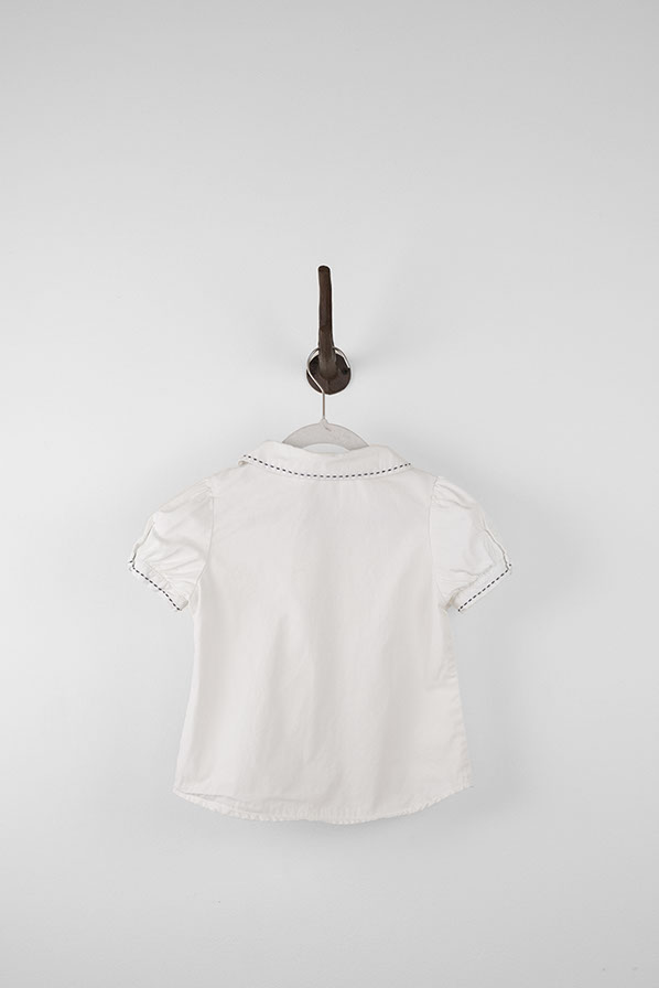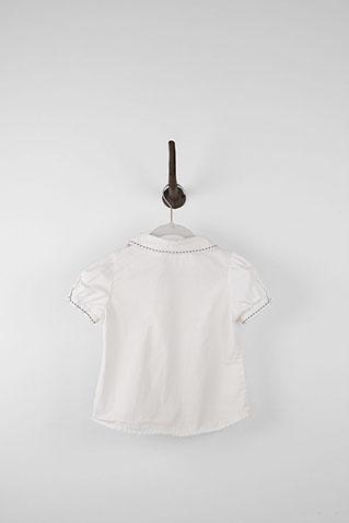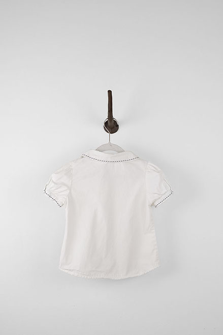 Adorable white top with stitch outline details on collar and sleeves. Top features short, puffy sleeves, full length buttons on front, and one button on each sleeve.