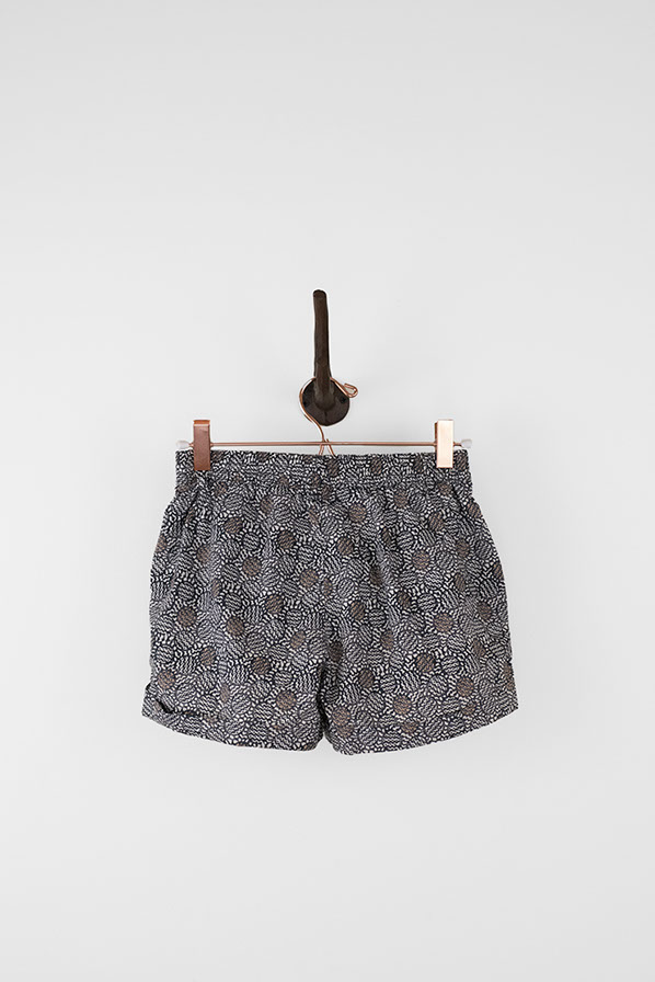 Super chic shorts with abstract pattern. Shorts are dominantly grey with hints of black and copper. These shorts feature belt loops, an elastic waistband, two front pockets, and cuffs on legs.