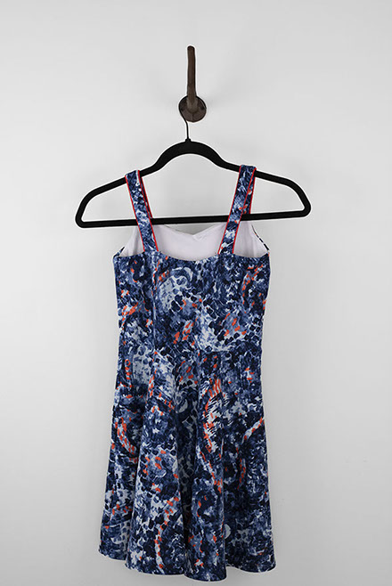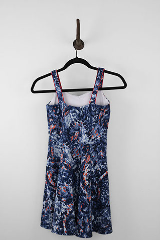 Beautiful, rare Impressionist dress with a-line skirt and sweetheart neck. Dress also features straps with red lined embellishments.