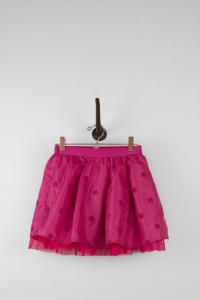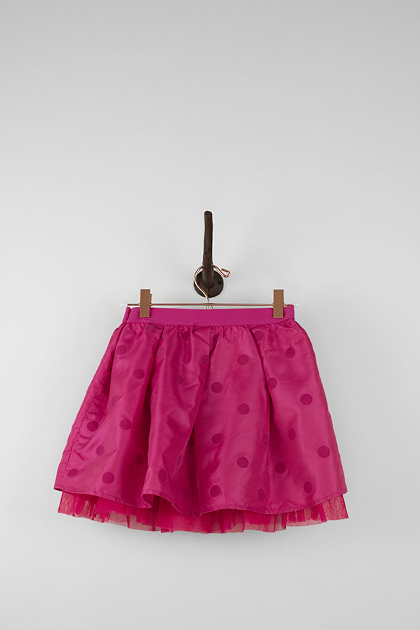 Adorable hot pink, polka dot tutu with tulle on bottom. Skirt also has an elastic waistband.