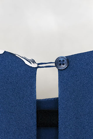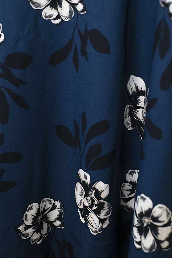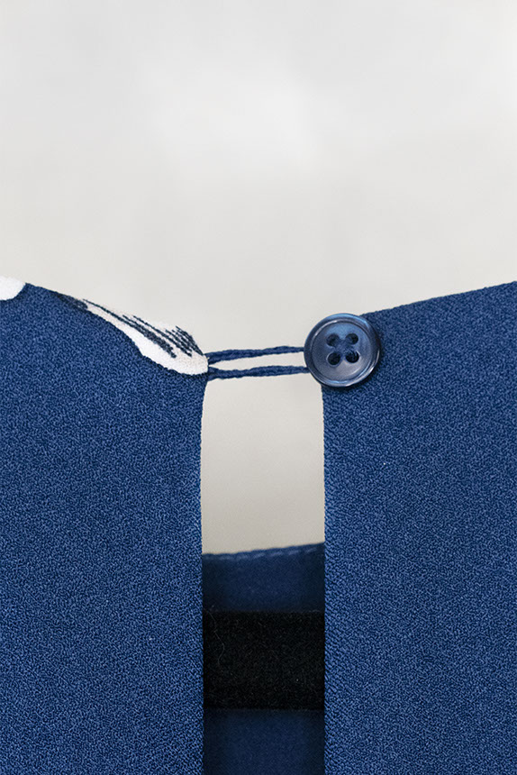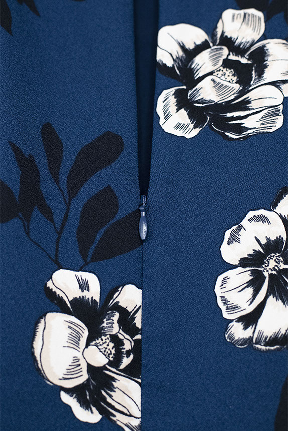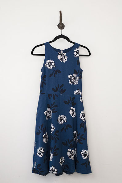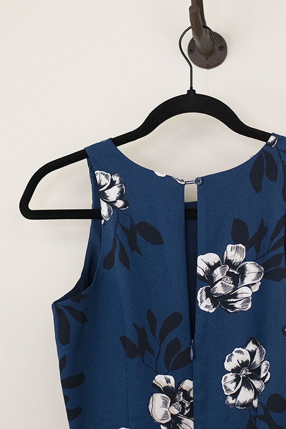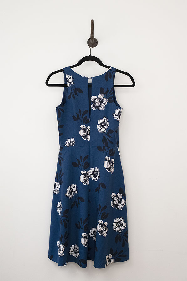 Beautiful sleeveless deep navy blue dress with vintage floral pattern. Features a scoop neckline, zipper in back, and an a-line skirt. Dress has a peek-a-boo area in back just under a button on the back collar. Dress falls just past the knee.