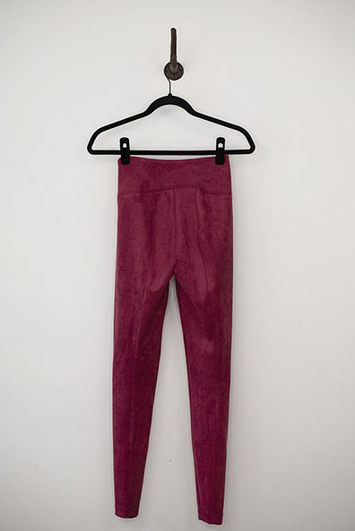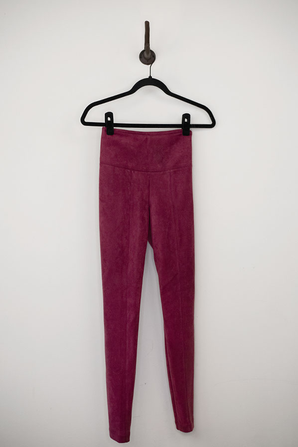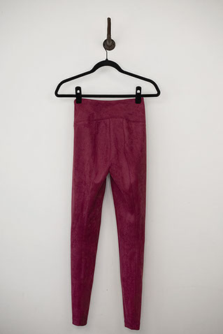 Super slim maroon burgundy leggings. Bottoms feature a faux soft suede material, wide elastic waistband, seams down front and back, and a narrow ankle length.