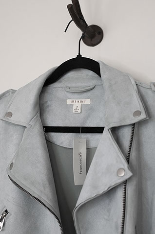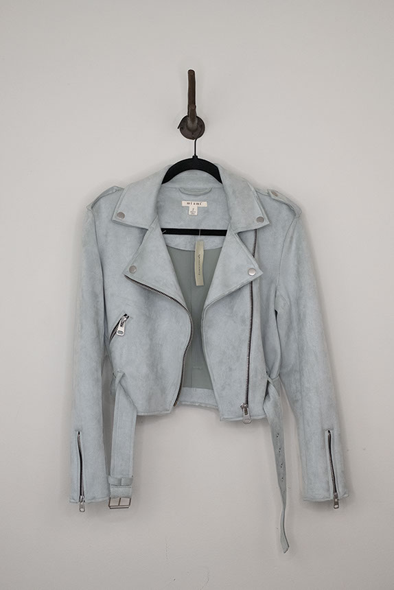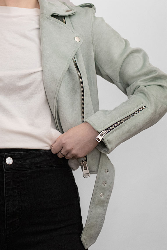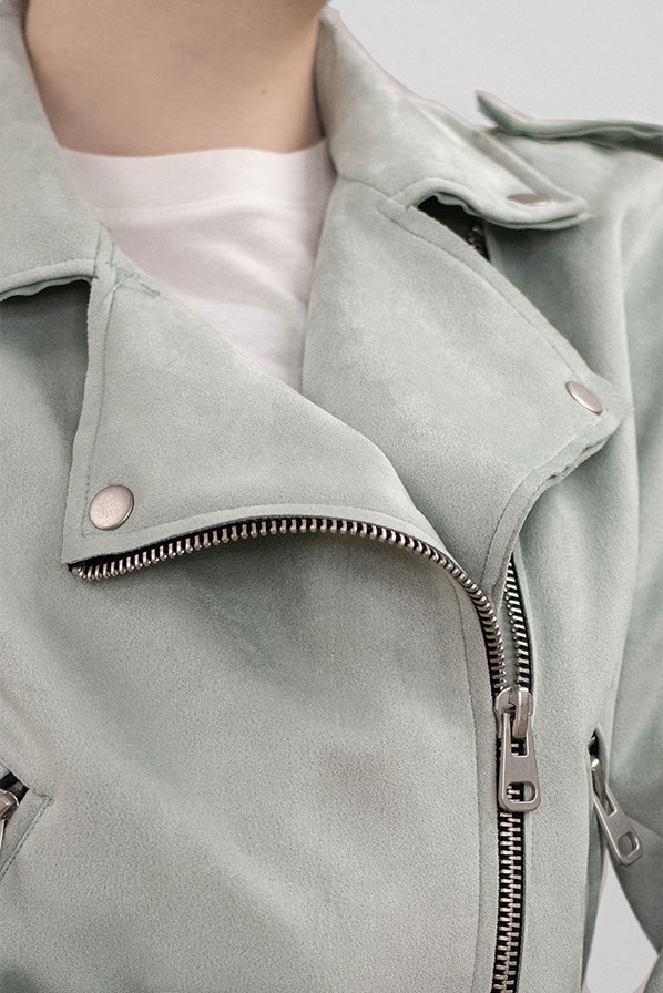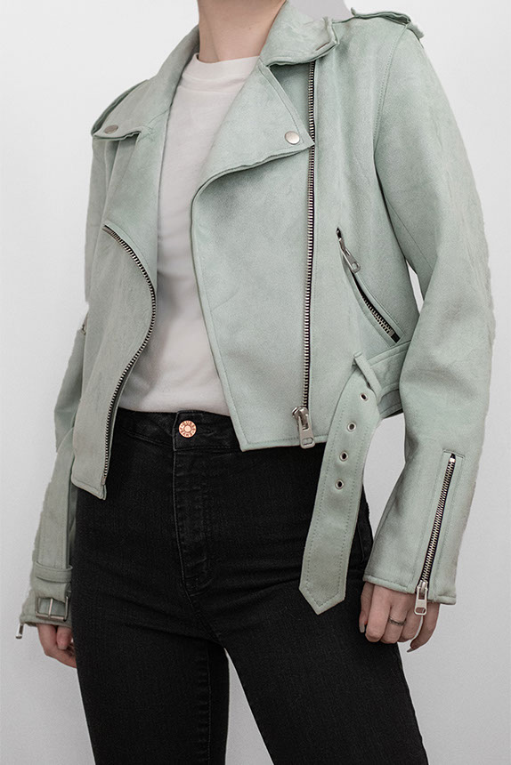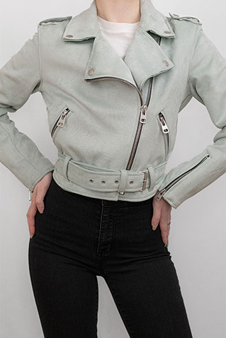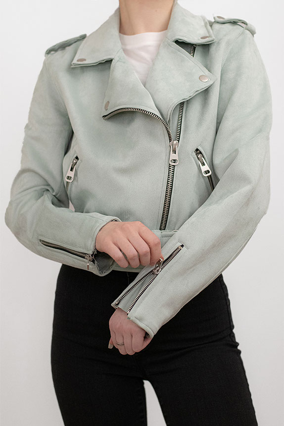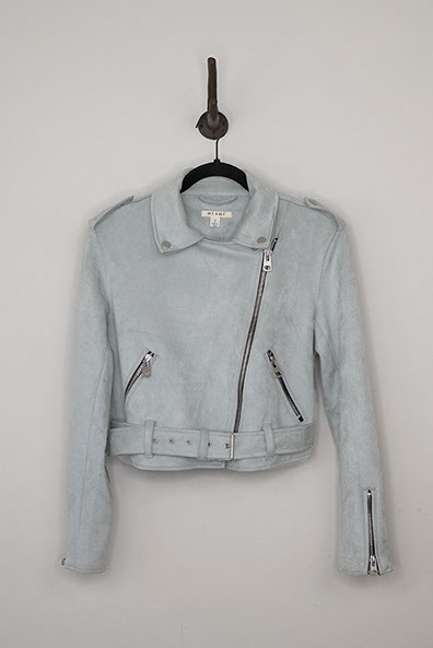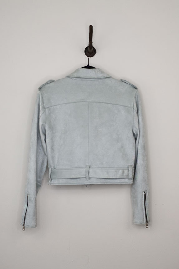 Remarkable faux suede seafoam moto style jacket. Piece has collar with snaps, front zipper, two front pockets with zipper details, adjustable belt, and belt loops. Jacket also features three snaps on lapel, zipper sleeves, and shoulder snaps. Regular fit and small size.