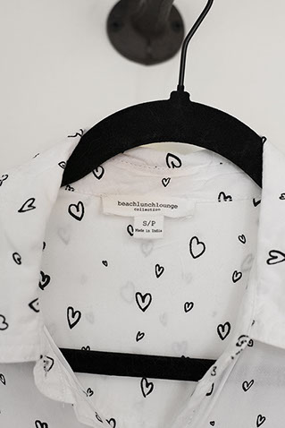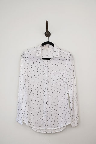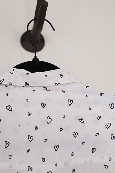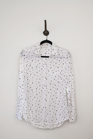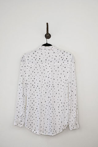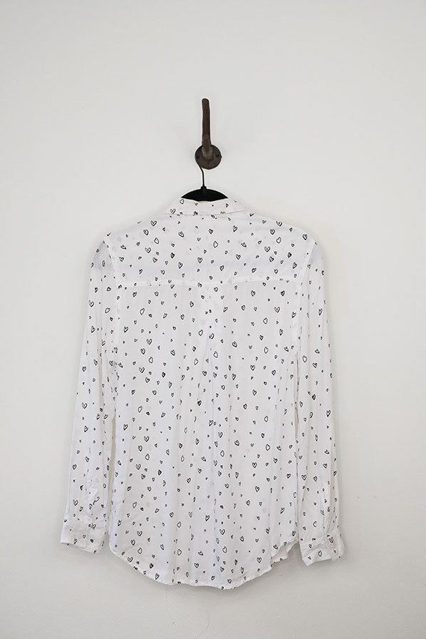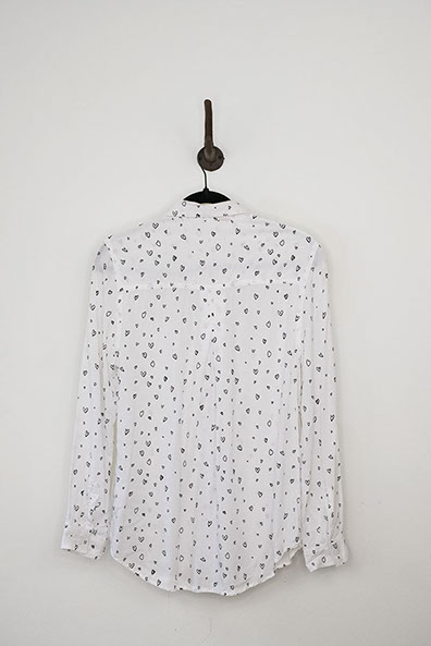 Lovely white button up top with black heart details. Features a front pocket, spread collar, a longer back, rounded hem, and buttoned cuffs. Top is slightly see-through and has a regular fit. Small petite size.