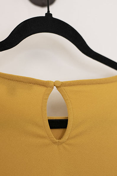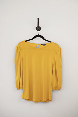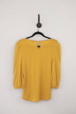 Gorgeous dandelion yellow blouse with three-quarter elasticated puff sleeves. Features a rounded neckline and bottom and a circular buttoned opening at back. Small size.