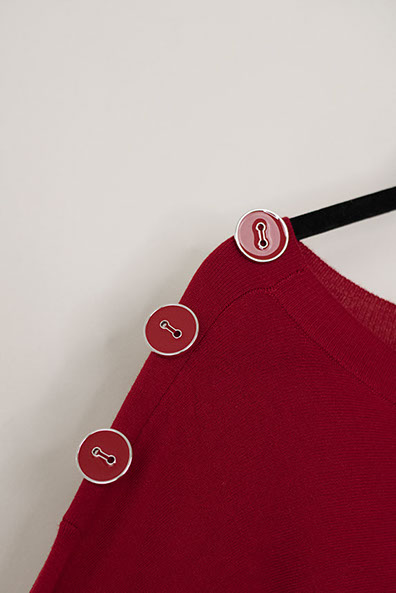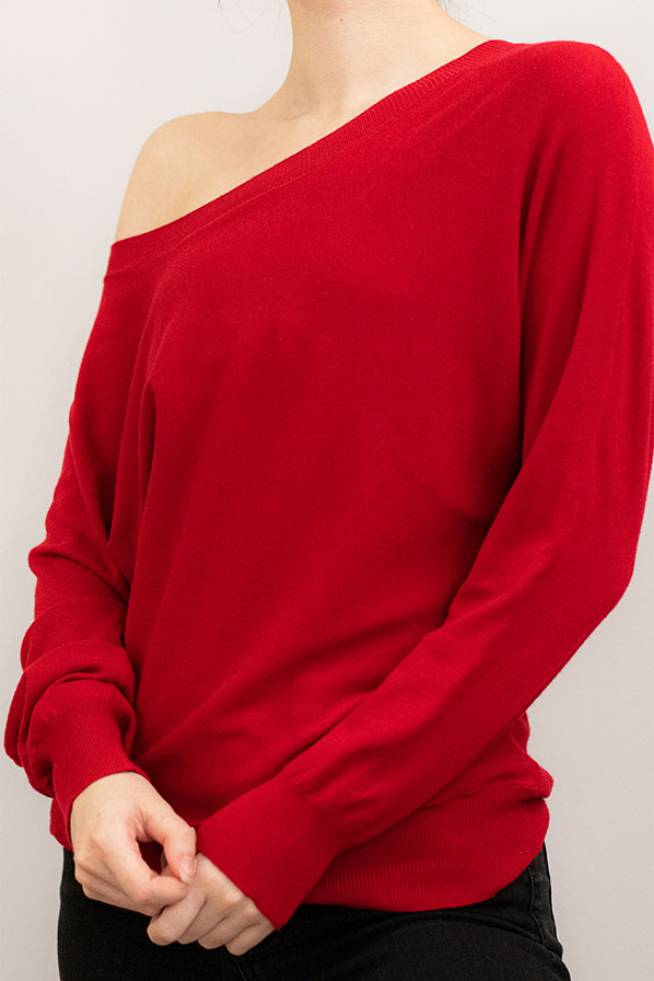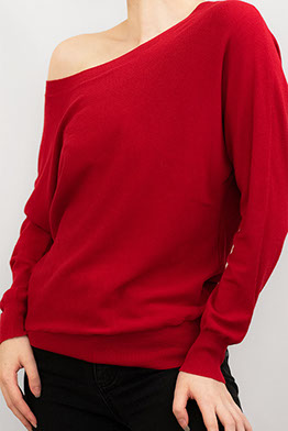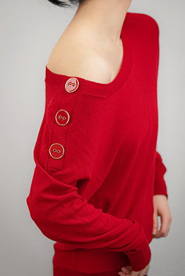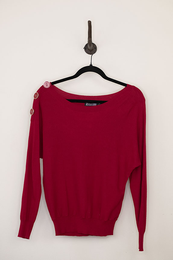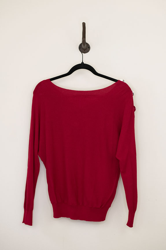 Lovely red long sleeve sweater. Piece has a rounded off shoulder, three red and silver buttons on right shoulder, as well as ribbed based waistband and sleeves. Slouchy fit, extra small size.