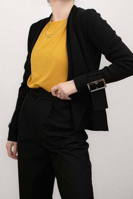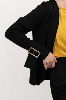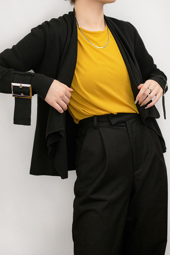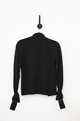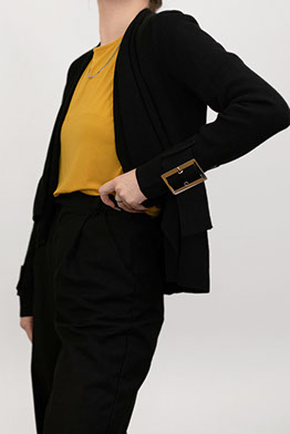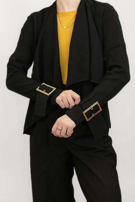 Silver Buckle Detailed Black Jacket with Draped Front