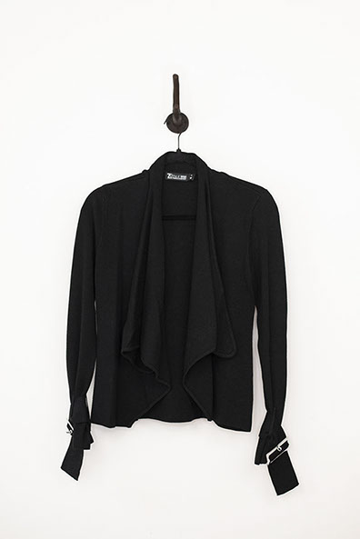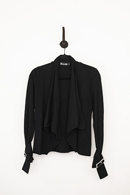 Fantastic black open front jacket with straight cut back and draped detail front. Features large silver buckles on wrists. Regular fit and extra small size.