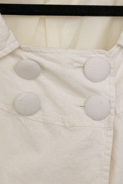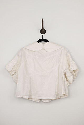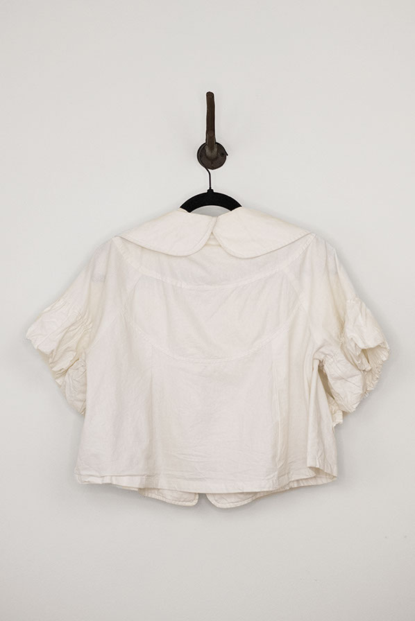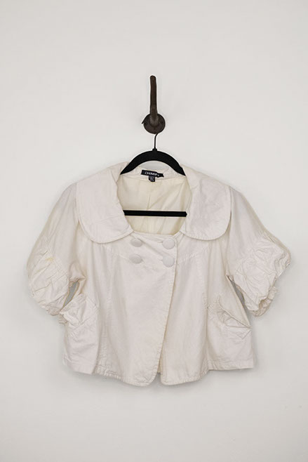 Incredible vintage creme bolero with gold threaded sheen throughout. Top features retro puff sleeves, a rounded collar, and square neckline. There are two small pocket and four front buttons. Jacket is lined.