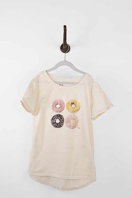 Cute donut t-shirt with embellishments on donuts. Top has a cropped front, scoopneck, and slightly rolled sleeves.