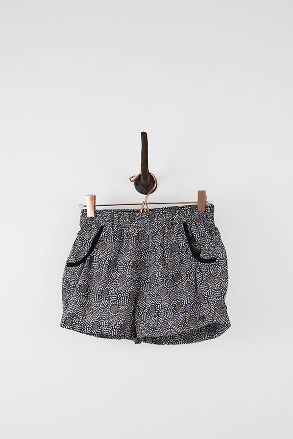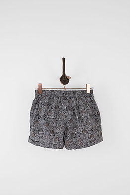 Super chic shorts with abstract pattern. Shorts are dominantly grey with hints of black and copper. These shorts feature belt loops, an elastic waistband, two front pockets, and cuffs on legs.